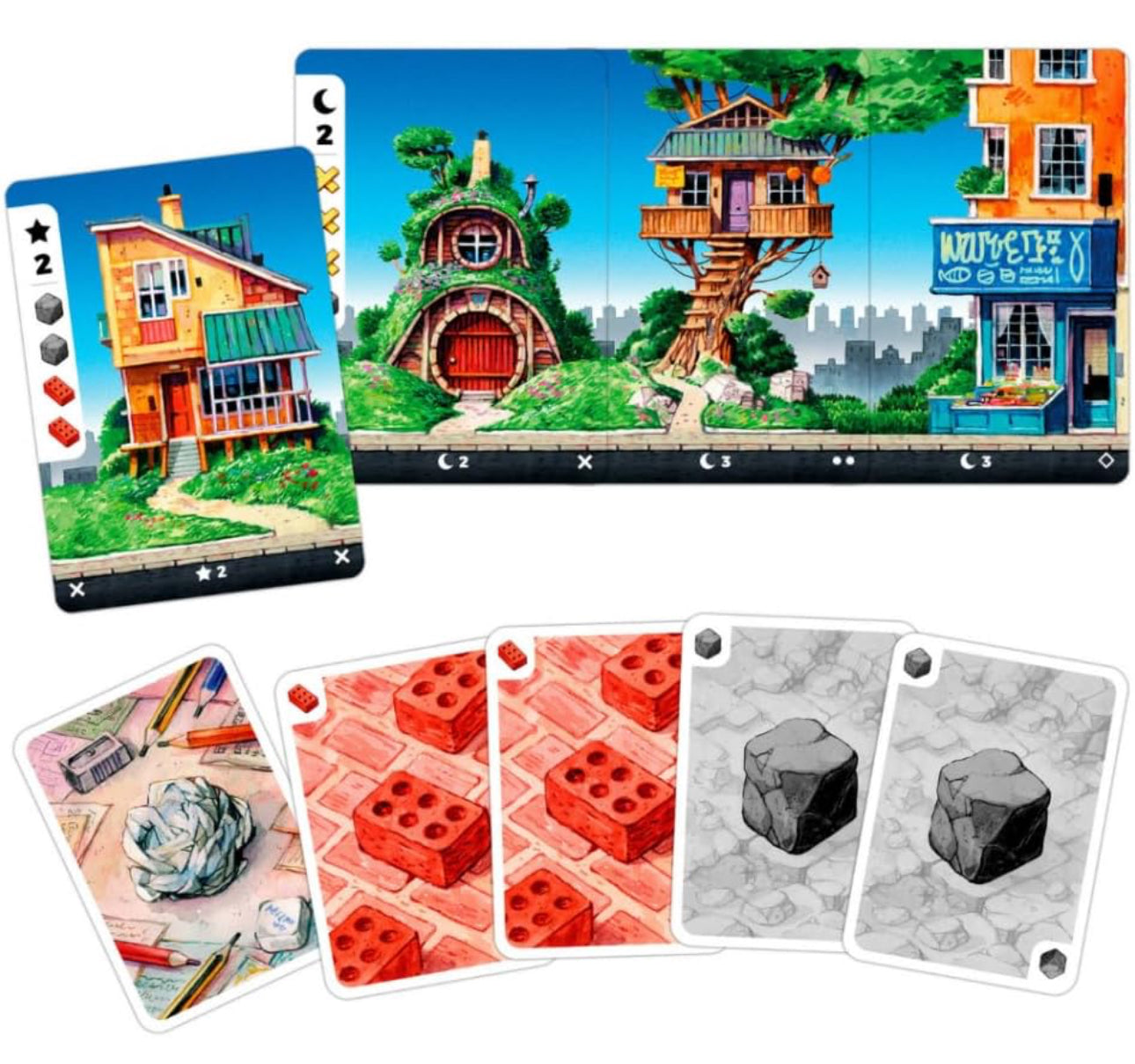 Barrio include 54 carte materiali, 39 carte casa e 6 carte aiuto e punteggio. Grazie alla varietà di elementi di gioco, ogni partita sarà un'avventura unica e piena di colpi di scena. Preparati a mettere alla prova la tua abilità strategica e a divertirti insieme ai tuoi amici nel costruire il quartiere più affascinante di tutti!