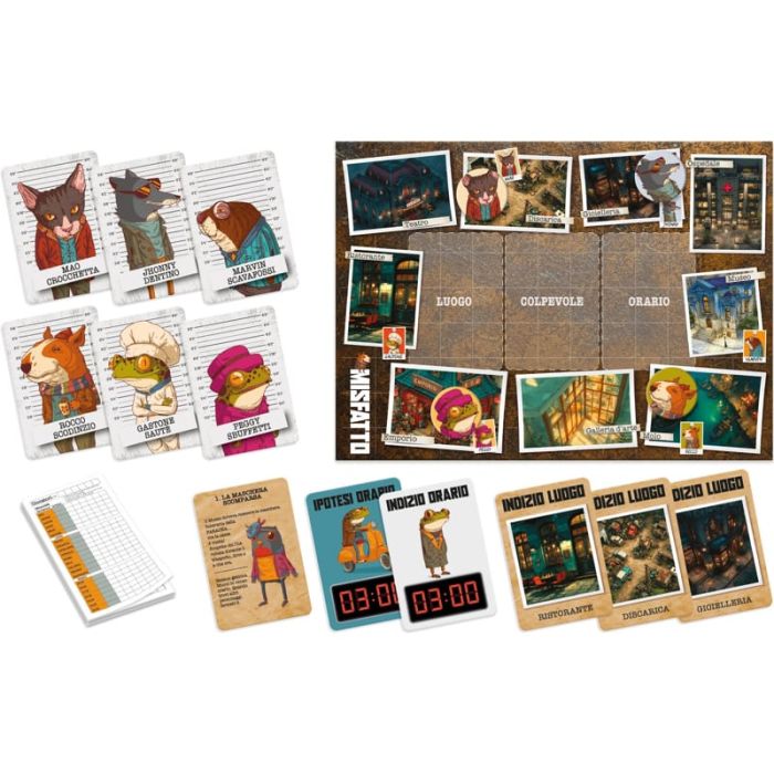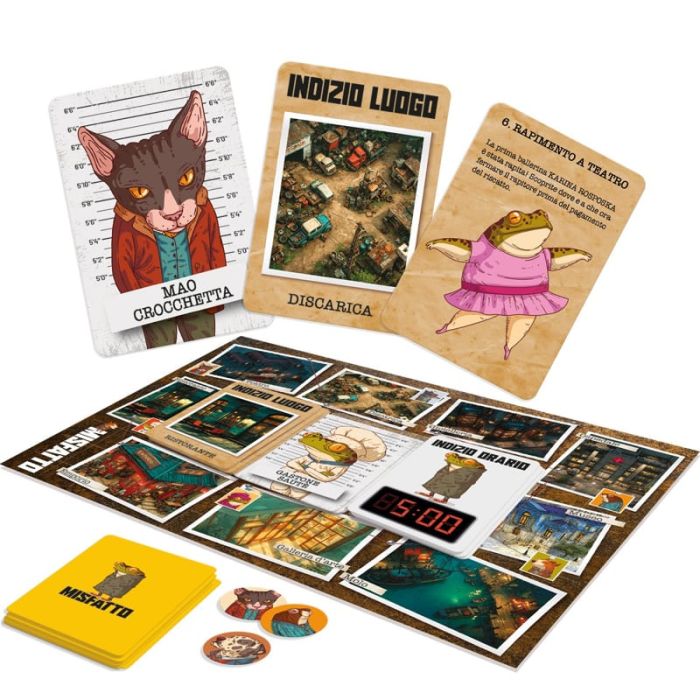 Misfatto è un gioco da tavolo investigativo di deduzione e bluff in cui i giocatori raccolgono indizi, ascoltano confessioni sospette e formulano accuse per ricostruire un crimine misterioso avvenuto nella notte.