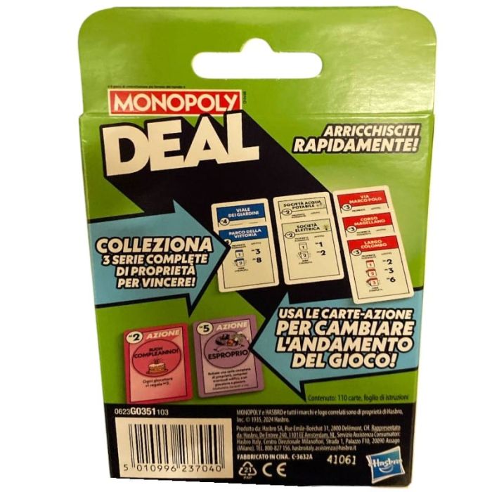 Monopoly Deal - Refresh si gioca con 2-3 giocatori e offre un'esperienza di gioco rapida e intensa. Ogni giocatore inizia con un mazzo di carte e l'obiettivo è quello di raccogliere set completi di proprietà. Le carte azione permettono di rubare proprietà agli avversari o di richiedere pagamenti, mentre i jolly possono essere utilizzati per completare i set di proprietà. Le carte Acquisto Forzato aggiungono una dinamica unica, permettendo ai giocatori di forzare gli altri a vendere le loro proprietà. La partita termina quando un giocatore completa tre set di proprietà, dichiarandosi vincitore. Le regole semplici e le meccaniche veloci rendono questo gioco perfetto per una serata di divertimento per famiglia.