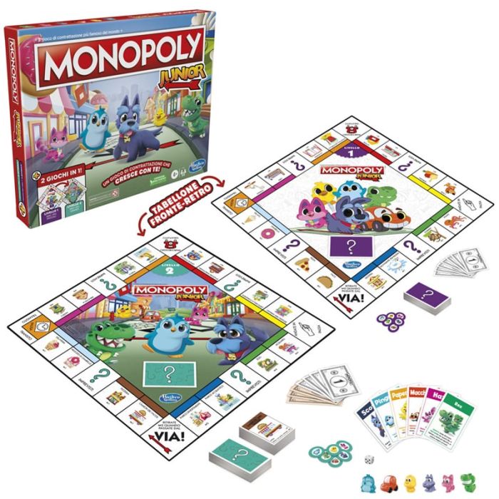 Immagini, componenti e colorazioni di Monopoly Junior - 2 Giochi in 1 potrebbero differire nel prodotto finale a causa di riedizioni, modifiche o integrazioni del prodotto.