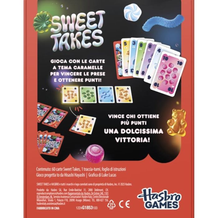 Sweet Takes è un gioco di carte che offre un'esperienza di gioco coinvolgente e strategica. Ambientato in un mondo colorato e vivace, il gioco si sviluppa attraverso una serie di turni in cui i giocatori cercano di ottenere il massimo punteggio possibile. Con un mazzo di carte numerate da 1 a 10 in diversi colori, Sweet Takes aggiunge un tocco di strategia e imprevedibilità che mantiene ogni partita fresca e stimolante. La combinazione di colori e numeri offre infinite possibilità di gioco, rendendo ogni partita unica e avvincente.