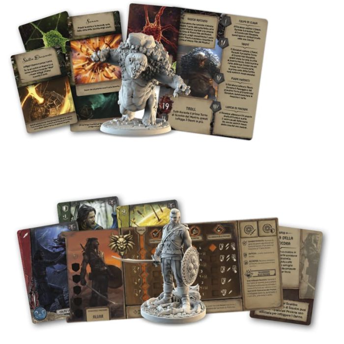 The Witcher - Il vecchio Mondo - Sulle Tracce dei Mostri introduce nuove dinamiche che ampliano vari aspetti del gioco: dalla caccia e il combattimento con i mostri alla costruzione del mazzo e sviluppo di combo. Potrai utilizzare bombe e potenziarti con i mutageni, oltre ad avere accesso a nuove carte per i mazzi di partenza. Questa espansione include un nuovo witcher della Scuola della Manticora, carte azione avanzate e carte mostro grandi, ognuna con abilità speciali e attacchi unici. Quando un mostro appare sulla plancia, la carta grande corrispondente viene posizionata accanto, visibile a tutti, aggiungendo un elemento strategico al gioco.