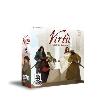 La scatola di Virtù contiene tutto il necessario per vivere questa avvincente esperienza di gioco: plance, tessere città, carte Notabile, Bonus Patrocinio, dischi di controllo e un assortimento di pedine e token per gestire le varie azioni e strategie. Il gioco include anche regolamenti dettagliati sia per 3-5 giocatori (L'Arte del Governo) sia per 2 giocatori (Le Grandi Guerre d'Italia), assicurando una modalità di gioco adatta a diverse situazioni e gruppi di giocatori.