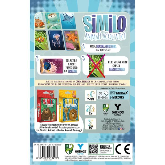 In Similo: Animali Acquatici dovrai far indovinare un personaggio segreto agli altri giocatori tra i dodici disposti sul tavolo. Per dare indizi, giocherai altre carte dalla tua mano, indicando se i personaggi sono simili o diversi rispetto a quello segreto. Turno dopo turno, i giocatori elimineranno carte fino a che non resterà il personaggio giusto. Se viene scartato per errore… tutti avranno perso!
