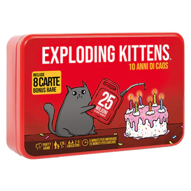 Preparati a festeggiare 10 anni di caos con Exploding Kittens! Questa edizione speciale celebra l'anniversario del gioco che ha conquistato il mondo. Ritrova l'emozionante meccanica di "Push Your Luck" e "Eliminazione Giocatore" in una confezione elegante e resistente in latta. Include le carte bonus rare reintrodotte da espansioni passate, aggiornate per celebrare l'evoluzione del titolo. Un party game perfetto per serate indimenticabili!