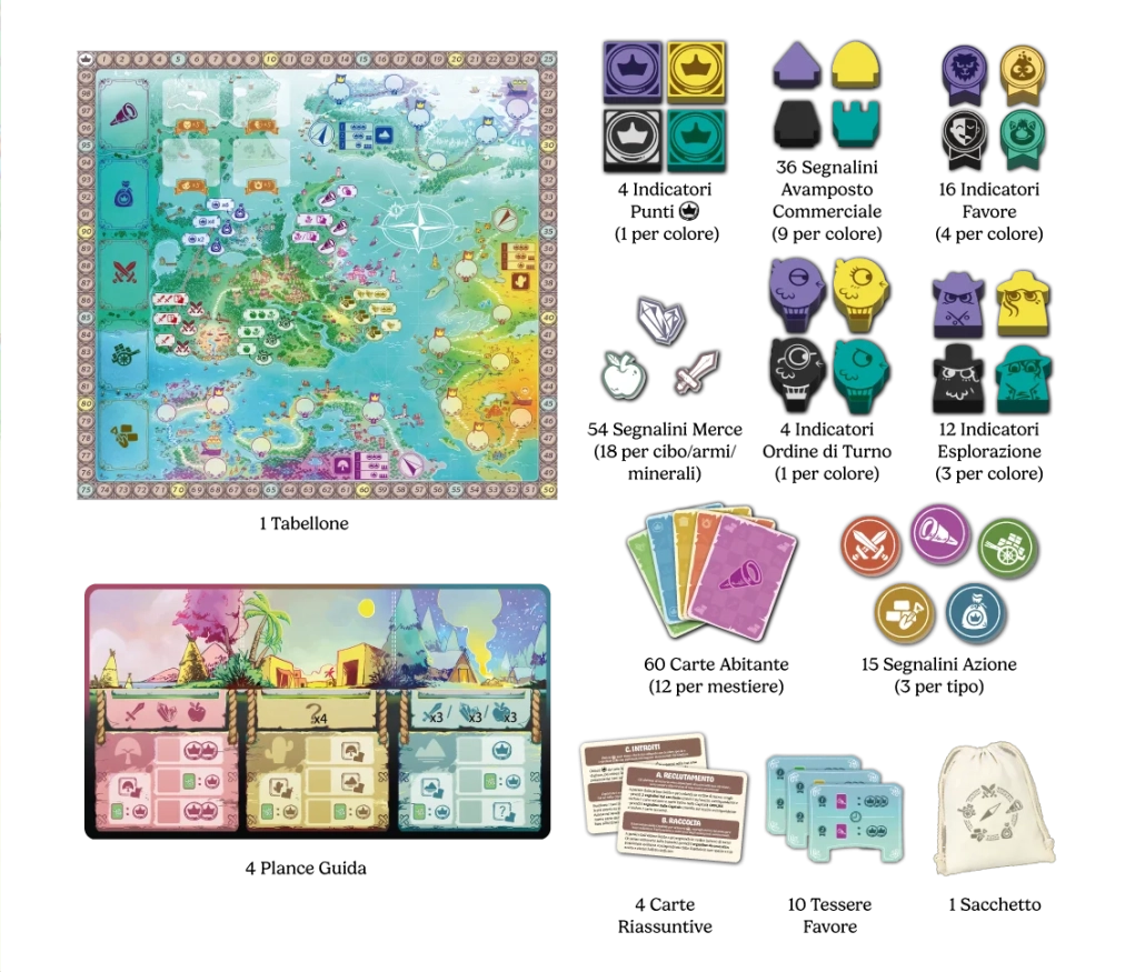 In Navoria, ogni giocatore veste i panni di un esploratore impegnato a guidare la propria spedizione verso la gloria. Combina strategia e intuito in un sapiente mix di piazzamento lavoratori e collezione di set di carte, affrontando partite sempre diverse e ricche di scoperte.
