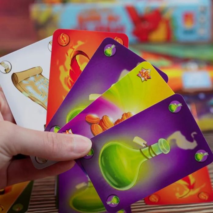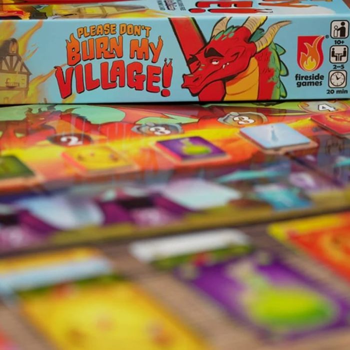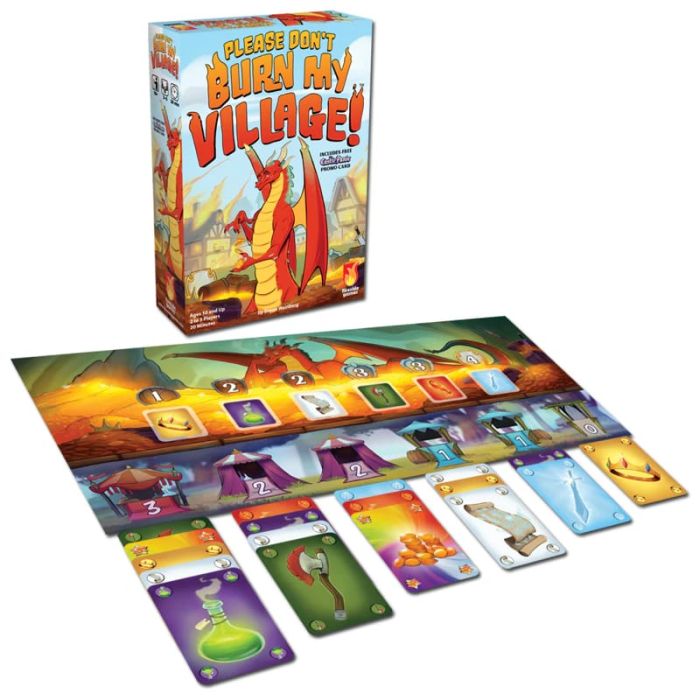 In Please Don’t Burn My Village! i giocatori raccolgono e offrono tesori sempre più potenti per convincere il drago a risparmiare il proprio villaggio. Ogni carta ha un valore che può cambiare nel corso della partita, rendendo ogni scelta un delicato equilibrio tra rischio e opportunità.