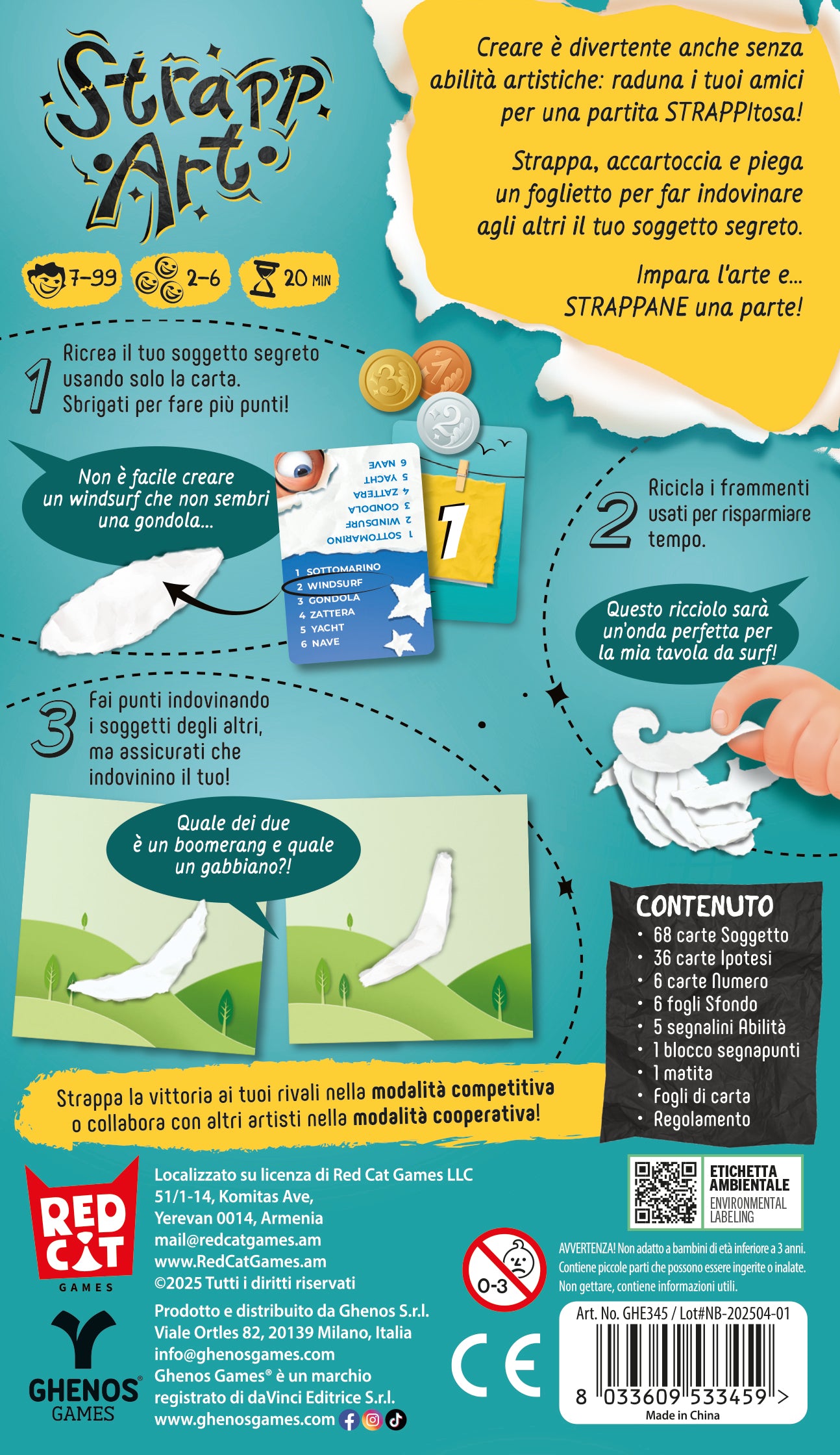 All'inizio di ogni round leggi ad alta voce la carta Soggetto, poi distribuisci una carta Numero coperta a ogni giocatore. Al via, tutti guardano la propria carta Numero (senza mostrarla) e iniziano a strappare, piegare o accartocciare un foglio per rappresentare il soggetto indicato dal numero sulla carta Soggetto letta in precedenza. Se finisci per primo, prendi un segnalino Abilità con un numero: vale punti extra solo se tutti indovinano correttamente il tuo soggetto. Quando l’ultimo segnalino è preso, parte un conto alla rovescia di 5 secondi, poi tutti si fermano. Prova quindi a indovinare i soggetti degli altri, piazzando una carta Ipotesi coperta. Si rivelano poi le Ipotesi e le carte Numero: guadagni punti per le ipotesi corrette e per ogni avversario che ha indovinato il tuo soggetto. Dopo 4 round vince chi ha più punti.