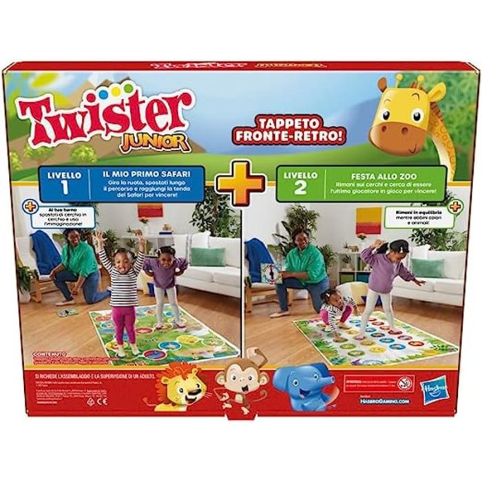 Questo divertente gioco per bambini e bambine dai 3 anni in su include un tappetino da gioco fronte-retro e una freccia girevole reversibile per 2 livelli di gioco. Sul lato del Livello 1, chiamato Il Mio Primo Safari, i bambini e le bambine devono girare la freccia per muoversi lungo il percorso del safari. Facendo a turno, ciascun giocatore ha la possibilità di scoprire i colori e imitare i versi e i movimenti degli animali. Capovolgi il tappetino da gioco sul lato del Livello 2, chiamato Festa allo Zoo, e fai ruotare la freccia per scoprire su quale colore e animale devi posizionare il piede o la mano. Vince il giocatore che rimane per ultimo! Twister Junior è un divertente gioco da 2 a 4 giocatori dedicato a tutta la famiglia, perfetto per attività di gioco da fare in casa.